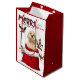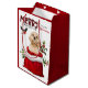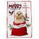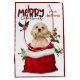The image on both front and back of this Christmas gift bag is an image of a cute blonde Cocker Spaniel dog peeking out from a Holiday gift bag. Behind him is a sprig of holly and red berries. A red and black bullfinch bird is about to land. Stylised red and black buffalo plaid text says MERRY CHRISTMAS". Your own signature is in two fields for you to customise. Be sure to see the matching products, including ornaments, in our store.