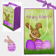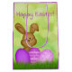 Make Easter egg-stra magical with this cute, colorful Easter gift bag featuring a sweet smiling cartoon bunny rabbit and purple Easter eggs on a grassy green background. Bag sides are purple. Perfect for kids, the bag reads "Happy Easter!" Design repeats on bag reverse. A fun touch for your holiday gifting.