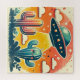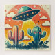 This playful and vibrant illustration features a cheerful cactus in a desert setting, being "abducted" by a UFO emitting a bright beam of light. The scene is filled with a warm sunset backdrop, desert plants, and a retro-style spaceship with colourful lights. The cartoonish design captures a fun extraterrestrial encounter with a kawaii cactus, adding a whimsical and humourous twist to a classic sci-fi theme. Perfect for quirky designs or fans of alien art with a cute, colourful, and lighthearted twist!