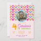 Colourful and playful 4th birthday party invitation, perfect for a girl's celebration and baby girl's celebration. The design features a vibrant butterfly pattern at the top, combined with a customisable section below for event details and blush pink background. Cute, girly and fun! A circular photo frame allows you to upload a picture of the birthday child, making it uniquely personal. The customisable text includes the child's age, name, and event information, presented in a mix of fun and cheerful fonts. This invitation is perfect for adding a personalised touch to your party planning. Great for birthdays of all ages, especially for young children.