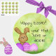 Make Easter egg-stra magical with these cute, colourful stickers featuring a sweet smiling cartoon bunny and purple Easter eggs on a grassy green background. Perfect for holiday gifting, cards or crafts, the sticker text reads "Happy Easter!" with additional space for your own message (or leave blank). A fun, whimsical addition to your Easter celebrations. Great for kids or adults alike!