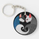 Artistic representation of two cats facing each other, intertwined in a circular design. The cats are depicted in contrasting black and white colours, with vibrant red accents on their ears and eyes. The background features a gradient of blue and black, enhancing the overall visual contrast and symmetry of the composition.