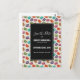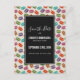 A save the date party postcard with a cute pattern of macarons in many different colours with a faint polka dot pattern behind. A black rectangle layered over top with your text inside.