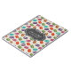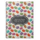 A personalised notebook with a cute pattern of macarons in many different colours with a faint polka dot pattern behind. A fancy vintage-looking grey and white decorative frame with your text inside.