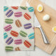 Kitchen towel with a cute pattern of macarons in many different colours with a faint polka dot pattern behind.