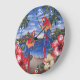 Beautiful and colourful red, blue and gold yellow coloured Macaw parrots, exotic tropical flowers, and a blue ocean in the background against a summery blue sky. Contemporary design for the lover of nature, wildlife, animals and the tropics. Original wall clock decoration for your master or children's bedroom, nursery, man cave, living or family room, dorm, log cabin, beach house, country cottage, vacation home, RV or office.