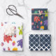First sheet has cute, colourful monsters in a large pattern on white background. Second sheet has cute, colourful monsters in a small pattern on a navy blue background. Third sheet has a gradient, diamond pattern in navy blue on white background. These funny monsters are purple, blue, teal, green, red, and pink.