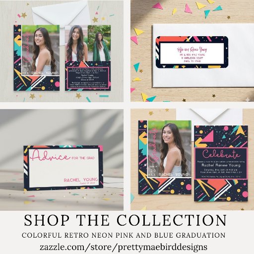 Step into the vibrant world of the '80s with our retro-inspired graduation invitation return address label! Against a backdrop of deep navy blue, bursts of neon pink, electric blue, and lime green form abstract shapes reminiscent of the era's iconic aesthetics. Let the colours of the '80s ignite excitement and nostalgia as we come together to honour a milestone worth celebrating!
