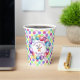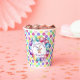 A cute colourful watercolor bunny surrounded by colourful balloons and polka dots adorns these paper cups.
