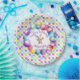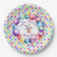 A cute colourful watercolor bunny surrounded by colourful balloons and polka dots adorns these paper plates.