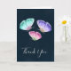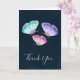 Thank you card with a delicate nature design. 3 watercolor butterflies, painted pink, purple and green. Dark blue watercolor background.