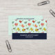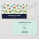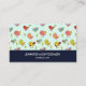 A business card with a pattern of hand-drawn whimsical birds. Cute little green pine trees between them.