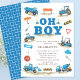 Cute Oh Boy Baby Shower design featuring blue construction trucks with construction signs and tools. Visit our shop to view this design in other colours.