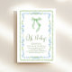 Charming and cute gender-neutral baby shower invitation featuring vintage-inspired green and blue watercolor frames, a green coquette bow watercolor, "Oh Baby" showcased in a chic script, and the name of the mother-to-be and shower details in classic serif typography.