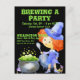 A cute, red-headed witch, dressed in purple from her tippy hat to her kicky boot slippers (except for her striped socks) holds a spoon above a cauldron boiling with green bubbles. Her black cat looks on in approval. At her feet and the feet of the round, metallic pot are colourful mushrooms. All illustrations are in watercolor. The background is black. An interesting "Eyeballs" font has been selected for the most prominent lines of type, all in a bright green to match the witch's brew. For RSVP, we have used "Regrets Only". However, if you want a different RSVP, there is room for an extra line or two. The back is typical postcard, with your return address and personal message in the same fonts as the invitation on front -- only green against white. Also on the back, our adorable witch is riding her broom above the "Kindly Deliver To:"