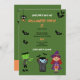 Cute Costume Halloween Party Invitation with fun Halloween Characters Frankenstein, Dracula and a cute Witch with bats and spider friends Halloween festive typography that you can easily personalise.