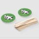 Our cute black and white friesian milking cow is in a meadow of green grass eating yellow daisies. Lots of bovine fun!