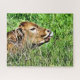 A beautiful cute calf lying in long grass with his tongue sticking out.
