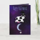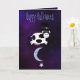 Magical & pretty blue and black starry night sky customisable Happy Halloween greeting card with a super cute happy smiling cartoon cow wearing a witches hat jumping over a happy moon and star - By Molly Sky Designs. Card is illustrated inside and out.