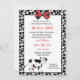 Cow Print Baby Shower Invitations with a red and black dotted bow and cow pattern and corresponding background. Cute graphic of a calf that can be removed if you prefer.