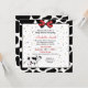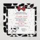 Cute Cow Print Baby Shower Invitations with a red and black dotted bow and cow pattern background. Design also has a graphic of a calf and gold and black dots.