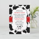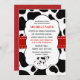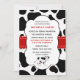 Cute Cow Print Red Black Invitation with a red ribbon. Cute graphic of a black and white cow. Neutral design for girls or boys.
