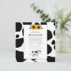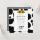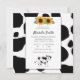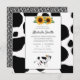Cow Print Baby Shower Square Invitations with a cow pattern background, a cut cow, and sunflowers. Cute graphic of a calf wearing a sunflower on her ear.