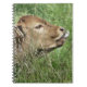 A beautiful cute calf lying in long grass with his tongue sticking out.