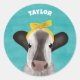 These stickers are ready to be personalised with your name or other custom text. They feature my cute painted illustration of a cow wearing a yellow bow set against a turquoise blue background. Your text appears in white lettering above the graphic.