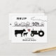 This wedding RSVP card features a silhouette cow, calf and tractor. They are set against a charming line drawing country farm.