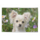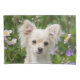 A young long-haired cream white colored Chihuahua dog sitting in a flowering garden, photo taken by Katho Menden. This pillow case is a gift idea for dog lovers.