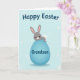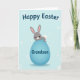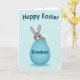 This card features a sweet gray bunny with soft pink inner ears, shiny dark eyes, a tiny pink nose, and a gentle blush, giving it a tender, friendly look 🐰. The bunny sits atop a large oval egg in a calm robin’s-egg blue, as if posing for someone it cares about. Soft shading along the egg adds depth, and a small fluffy white tail peeks out behind the bunny for a cozy touch. The background is pale blue with scattered white circles and starburst-like shapes that feel like light confetti drifting around 🌷. Near the top, a rounded seasonal greeting appears in dark lettering, centered above the bunny and egg. On the blue egg, a smaller line of text is placed across the front in a darker contrasting color, like a name or short note meant for a close friend. The bunny’s ears tilt slightly outward, and the egg’s smooth gradient shifts from lighter blue at the top to deeper blue along the lower curve.