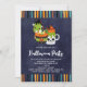 Halloween party invitation with a Halloween cupcake with a big eyeball. A green popsicle in the shape of Frankenstein's monster. A cup with a skull face filled with treats and dripping green goo.