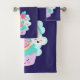 Towel set with a cute illustration featuring a cupcake and ice cream smiling with joy. A rainbow and hearts surround the drawing. A cute fluffy cloud is also smiling with happiness. The cupcake and ice cream have a trendy unicorn horn on top. Cute and adorable design full of joy.