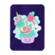 A flexible magnet with a cute illustration featuring a cupcake and ice cream smiling with joy. A rainbow and hearts surround the drawing. A cute fluffy cloud is also smiling with happiness. The cupcake and ice cream have a trendy unicorn horn on top. Cute and adorable design full of joy.