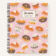 Cute cupcakes, doughnuts, cinnamon rolls and pies with text recipe notebook on light pink background