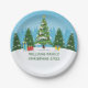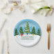 This beautiful personalised Christmas tree paper plate features pretty green fir trees capped with snow on a lovely winter landscape and blue sky. Customise with your family last name and year. Cute custom holiday party decor.