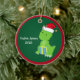 Customise this cute baby dinosaur Christmas ornament with your child's name or other text inside the green and red circle. Personalised kids ornament with a dino in a Santa Claus hat holiding a holiday gift.