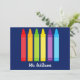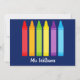 Beautiful custom elementary school teacher or principal card with a name under the cute rainbow of crayons on a navy blue card. An adorable gift for a preschool teacher.