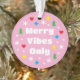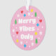 Get into the festive spirit with a custom photo ornament! A playful design with snowflakes, hearts, stars and Christmas trees, all adding to the cheerful vibe. The template is personalized with a favorite photo, and incorporates simple typography with the phrase “Merry Vibes Only”. This modern retro style is perfect for photos of kids, teens, friends, family, and pets – a unique keepsake gift idea, and a fun way to add a personal touch to your Christmas tree decorations. Printed colors: pink, green, red, blue, yellow and white — or change the colors with the design tool.