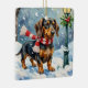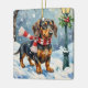 This charming design features an adorable Dachshund, often called a 'wiener dog,' bundled up for a cozy stroll in the snow. The beautiful watercolor art captures the playful spirit of the breed, wearing a festive red knitted scarf against a quaint, snowy backdrop. A delightful choice for Dachshund owners and fans of small, cheerful dog art. Perfect for holiday ornaments, personalized gifts, and adding a touch of rustic cheer to your Christmas decor.