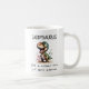 Cute funny mug ideal for Father's Day, Birthday, Christmas or just because featuring a cool cartoon watercolor dinosaur. Above the illustration is the made up word "DADDYSAURUS" in a simple black font. Below the illustration in a simple handwriting font reads " Like a normal dad, just more awesome".