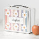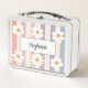 This cute lunch box features white daisies on a striped background in pastel colours. Easily customisable with your name. Great for Back to School or as a gift.