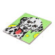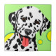 Colourful dog art featuring white Dalmatian with black spots against a light green background and yellow circles