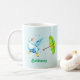 Happy duck adds fun to morning coffee or tea even if if it's raining. Splashing around with his green and polka-dot umbrella. Makes even a rainy day a good day. This mug would make a great gift! Personalise with name or initials!