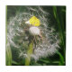 Cute white dandelion with a little yellow petal, and green grass. Marco nature photography.