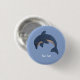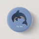 This round pin back button is a light blue colour with a cute deep blue sparkling look jumping dolphin with a white stomach and black and white swirl eye. Customise your text with the template.