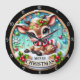 This charming round graphic is a festive Christmas design. It features a cute, wide-eyed deer wearing a striped scarf and holly on its head. The deer sits on snow, surrounded by colourful string lights and ornaments. A banner reading 'MERRY CHRISTMAS' completes the whimsical and heartwarming holiday scene.