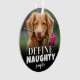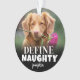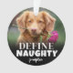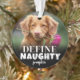 Personalised "Define Naughty" Dog Photo Ornament. Add some humour to your holiday season with this playful dog ornament, perfect for showcasing your pup’s mischievous side. The front features the text "Define Naughty" along with your dog's name in white text on a sleek black ombre background, making it a fun way to celebrate your puppy’s cheeky personality. There’s also space for a photo of your dog to capture a special moment. The back showcases a paw print design with a heart cutout in the centre, adding a personal touch. Both the font colour and paw print can be customised to match your style. This humourous keepsake makes a great gift for dog lovers and is perfect for the holidays, birthdays, or as a special pet memorial. Whether hung on the Christmas tree or displayed year-round, it’s a fun way to keep your pup close!