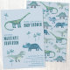 Fun little dinosaurs, Tyrannosaurus Rex, Triceratops and Diplodocus to welcome a little one into the world. Cute gender neutral baby shower invitation. Change the name and details to personalise. Back features a matching dinosaur pattern. Original art by Nic Squirrell.